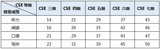 3.表2中呈现的是普思考试各技能对应CSE相关等级的临界分数。如:普思听力得14分,即达到CSE三级水平;口语得29分,达到CSE四级水平;写作得45分,达到CSE六级水平。
