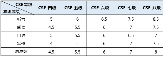 3.表1中呈现的是雅思考试各技能和总成绩对应CSE相关等级的临界分数(总成绩的临界分数是各技能临界分数的平均值)。如:雅思听力得5分,即达到CSE四级水平;阅读得5.5分,达到CSE五级水平;口语得6分,达到CSE六级水平。